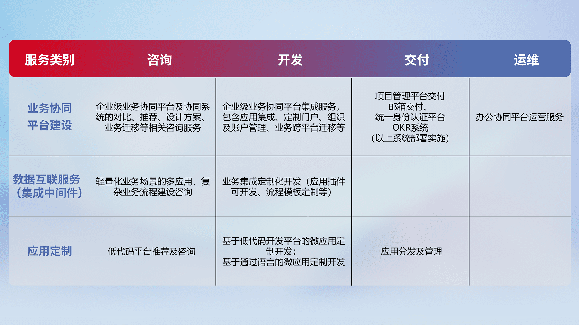 针对钉钉、、、企微、、、IDaas等平台级产品提供产品的规划、、、、方案、、、、交付、、定制化开发等服务,,,实现如统一协同办公、、智能客户服务、、、混合会议管理、、、、智能数据查询、、、、等业务场景,,,,实现数字化转型。。