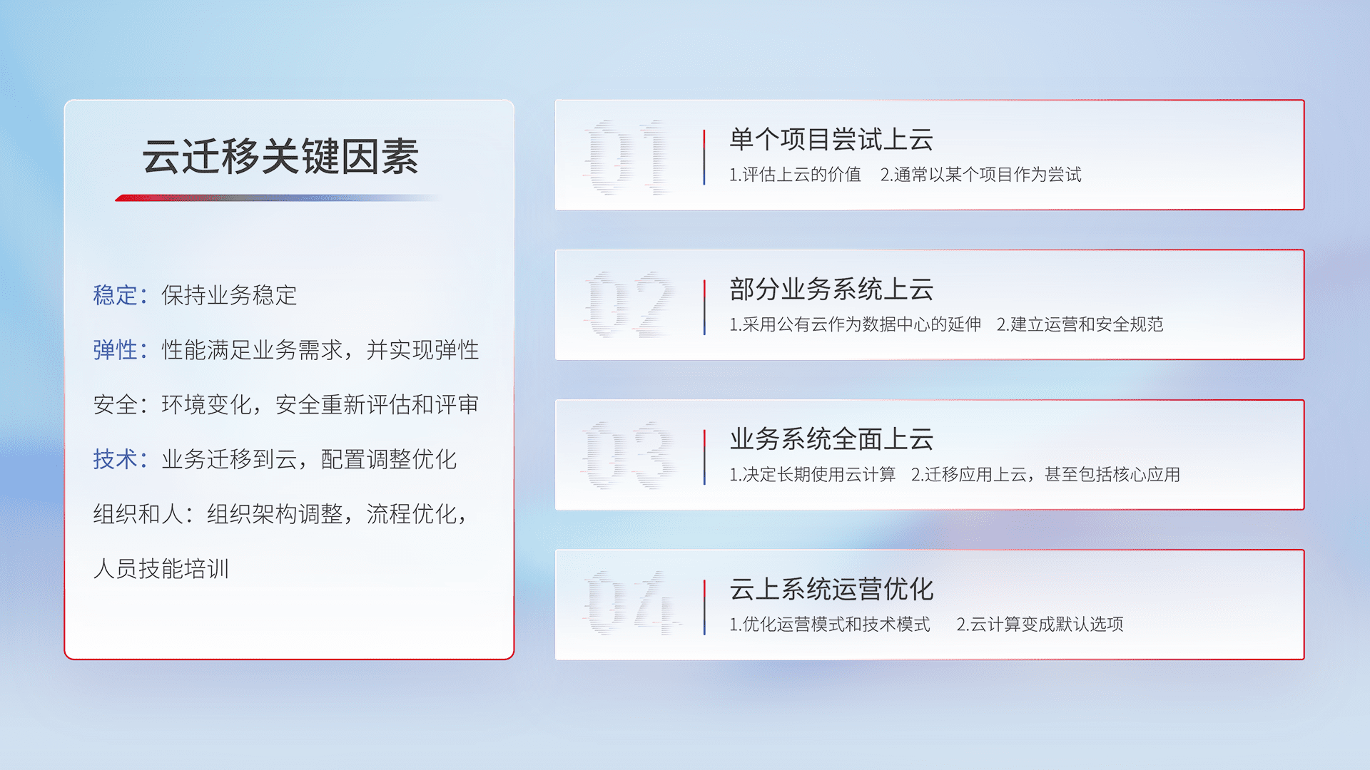 结合实际业务,,,,从规划设计、、云平台选型、、、、云原生改造、、、、数据迁移、、集成交付,,,,迁移全过程为客户识别最佳上云路径,,,做好风险识别管理,,,设计网络架构、、身份权限、、安全审计合规、、操作审计、、、、日志审计、、、、监控告警策略、、、多站点容灾设计等,,,,对云上基础设施进行整体规划,,,,提升IT治理水平,,,以满足弹性、、、、高可用、、、高性能的需求。。。。