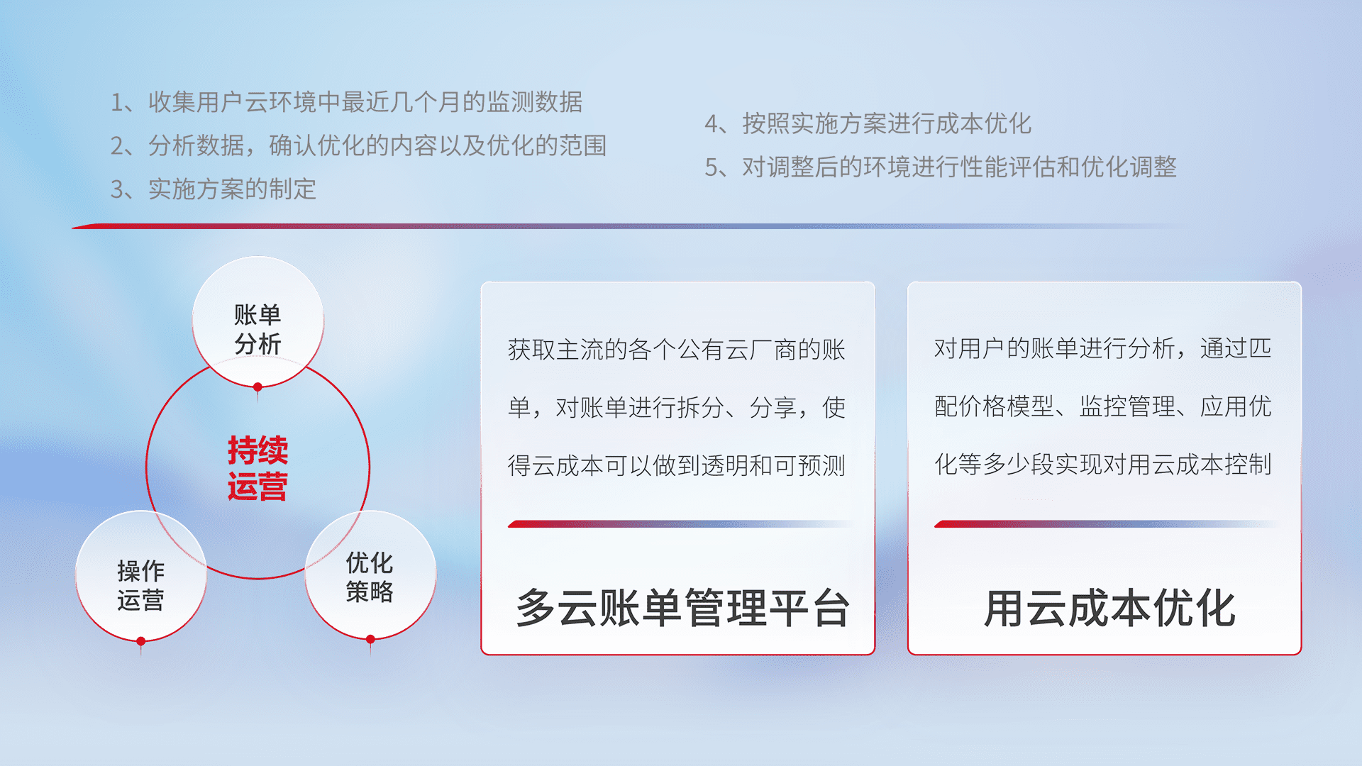 通过多云纳管,,以统一的资源数据模型把客户的云资源进行抽象和封装,,,,进而实现对多云资源的统一操作,,,保障云资源管理的可靠性、、稳定性与可用性。。。量身定制化运维内容,,,配置、、、、开发运维、、、、补丁管理、、、备份、、、、监控、、、认证和访问管理、、、、审计和日常巡检等,,,保障在用云过程中的可靠度,,稳定度以及高可用率。。。。