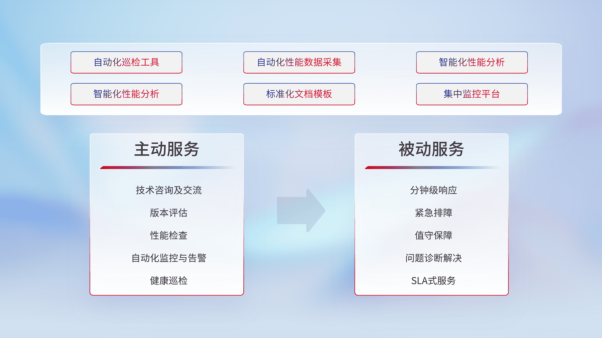 智能化工具和标准化文档,,保障服务质量,,,提供主动服务(包含技术咨询、、版本评估、、、性能检查、、自动化监控与告警、、健康巡检)和被动服务包含(分钟级响应、、、紧急排障、、值守保障、、、问题诊断解决、、、SLA服务)。。。。